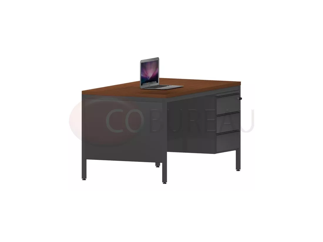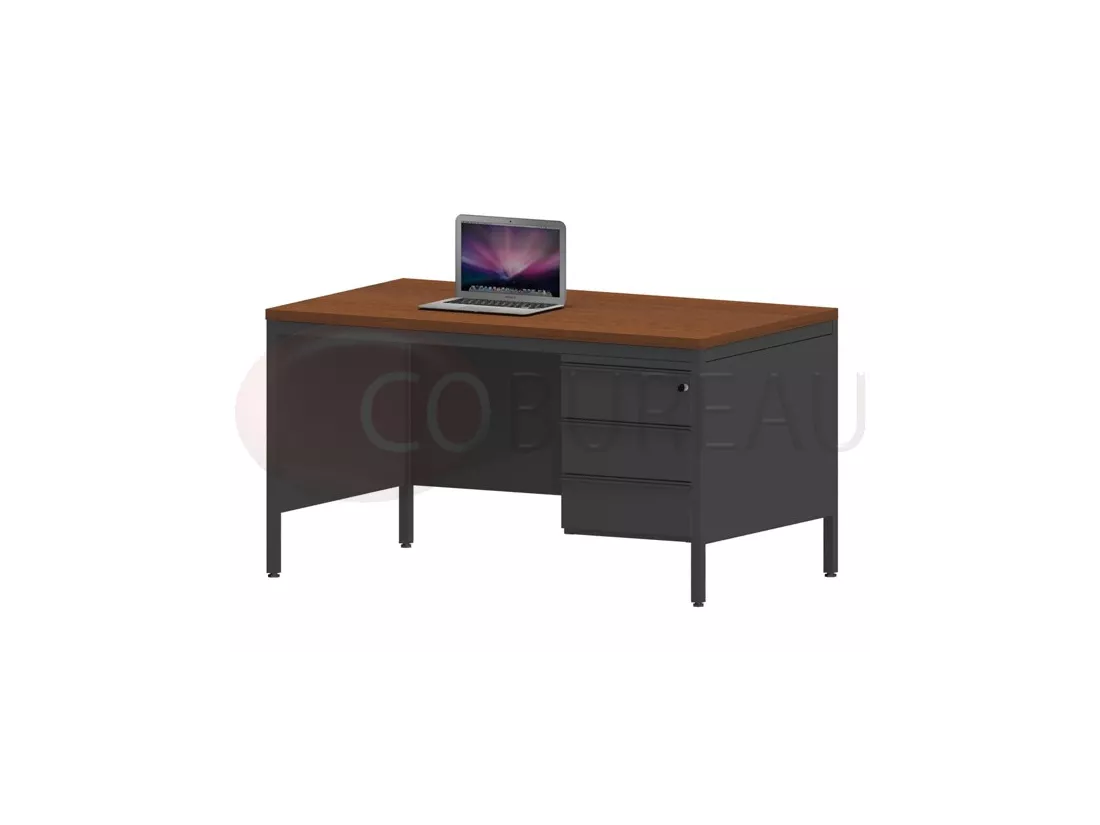 Bureau demi-ministre 140 cm métal caisson 3 tiroirs plateau noyer