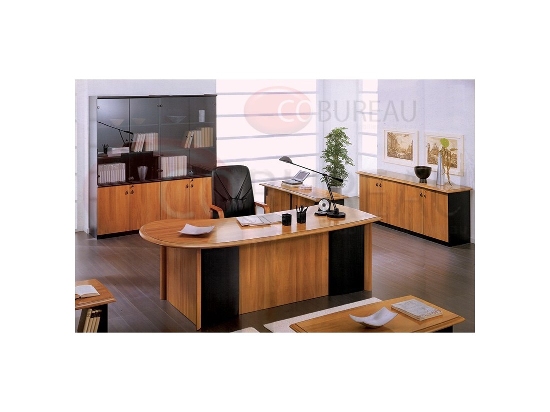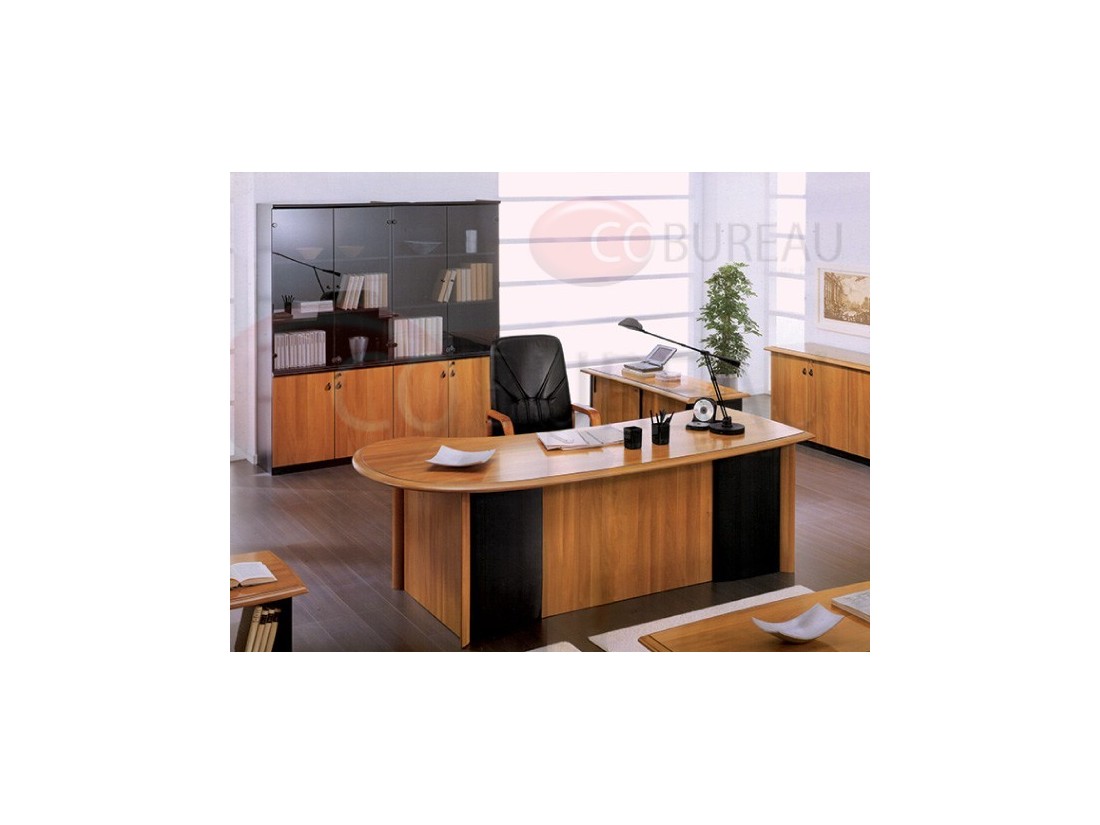 Superbe plateau arrondi L.220x P.100x H.74 cm, offrant de larges dégagements pour vos visiteurs et une ligne adoucie côté utilisateur. Panneaux-pieds avec découpe arrondie à la base et alaises quart de rond en hêtre massif. Voile de fond en retrait pour le confort des visiteurs. Console retour L.135x P.50x H.77 avec 2 portes coulissantes, 2 niches. Caisson mobile 3 tiroirs avec serrures. 2 Bibliothèques demi-vitrées L.90x P.45x H.206 cm.