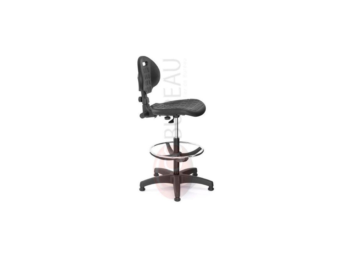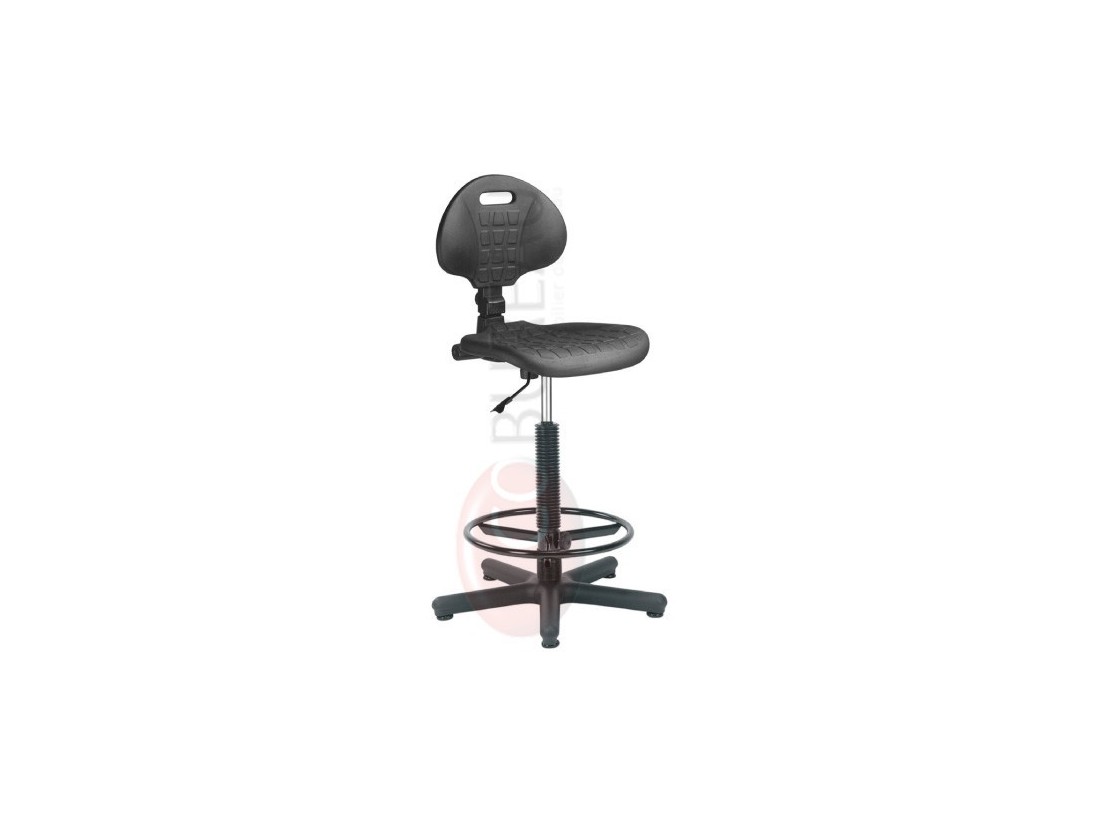 Assise et dossier mousse de polyuréthane. Moulage anatomique antidérapant. Assise réglable en hauteur de 57 à 82 cm par vérin pneumatique à amortisseurs. Dimension assise : L 47 x P 43 cm. Dossier H 31 cm, réglable en hauteur et en profondeur. Repose-pieds en métal chromé, réglable en hauteur.