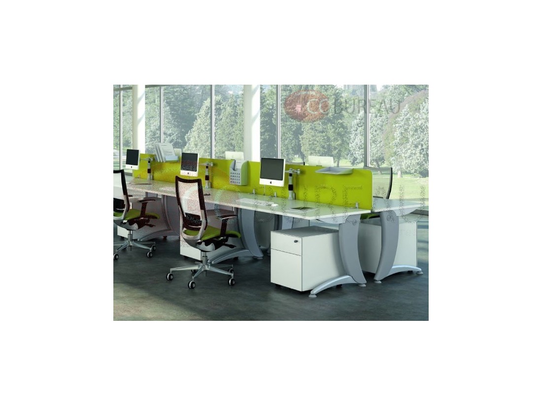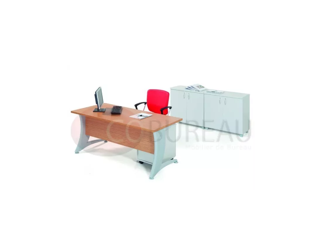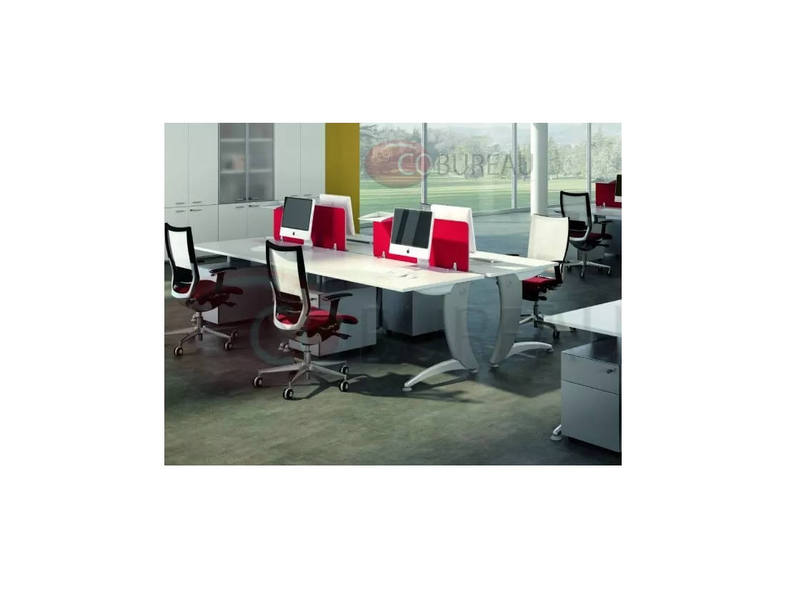 Surface de travail ergonomique. Intègre les espaces bureau, informatique et retour. Piétement " L" métal aluminium.
