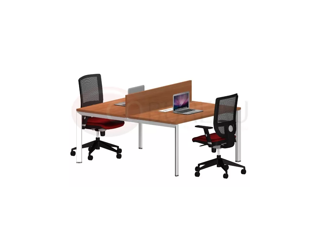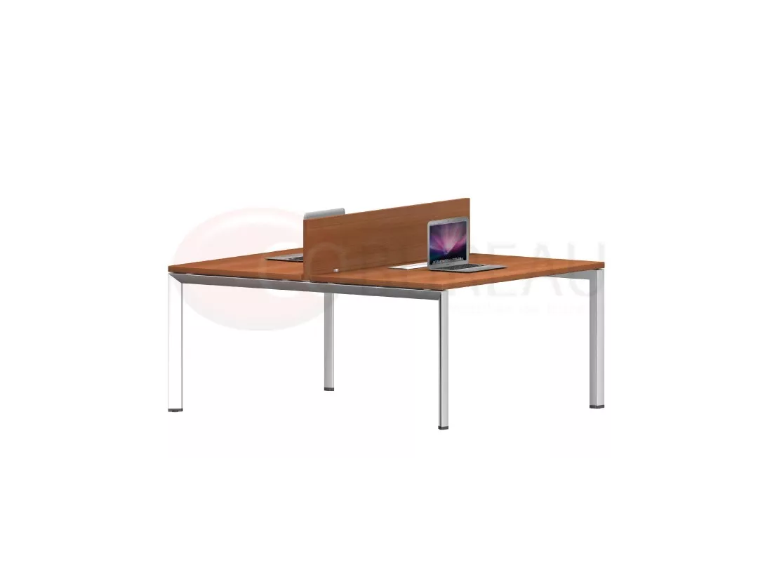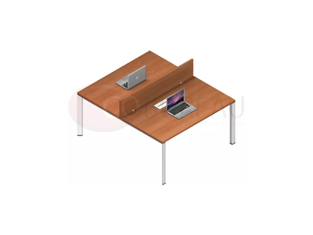 Bench de 2 bureaux 120 x 80 cm assemblés face à face, équipée de 2 Kits de connexion intégrés aux plateaux, cloisons de séparation en panneau de particules revêtement mélaminé antireflets, épaisseur 19 mm.