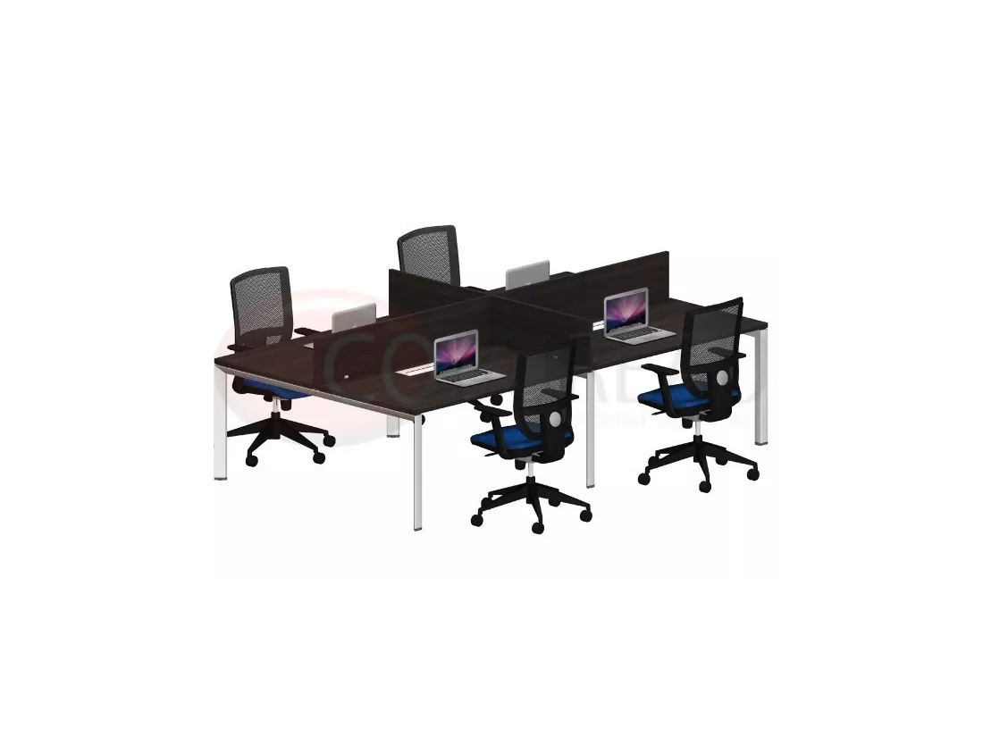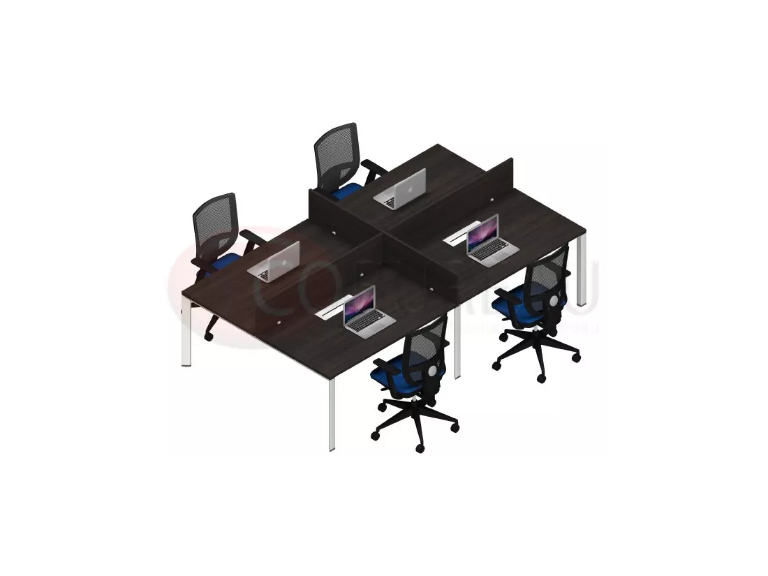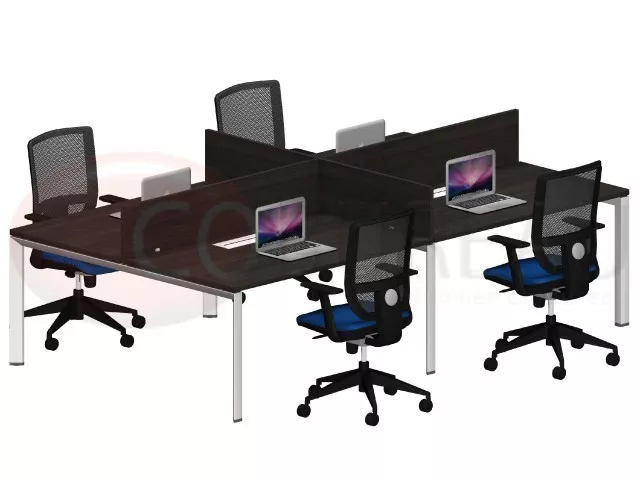 Bench de 4 postes 120 x 80 cm assemblés face à face, équipée de 2 Kits de connexion intégrés aux plateaux, cloisons de séparation en panneau de particules revêtement mélaminé antireflets, épaisseur 19 mm.