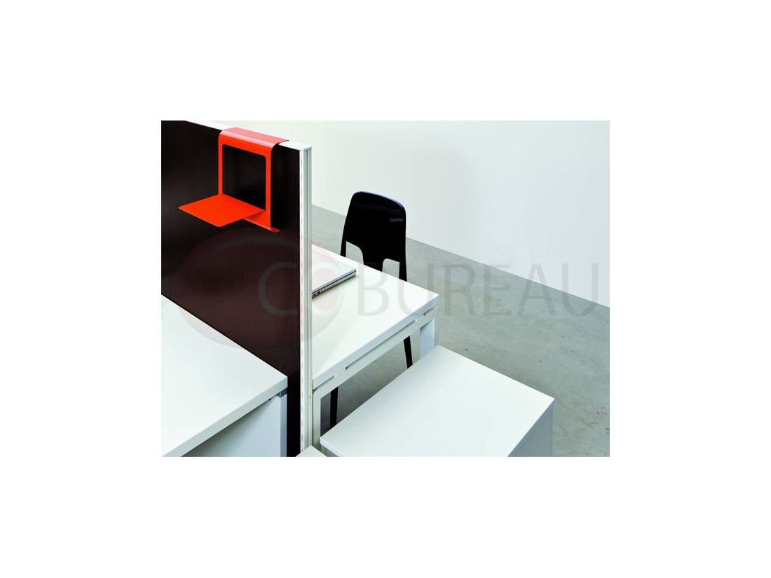 Cloisons, en mélaminé ép. 30mm, avec possibilité de partie supérieure en verre cadre en aluminium, profil supérieur en aluminium, profils crémaillères latéraux toute hauteur pour supports plans de travail, top réception et tablettes.