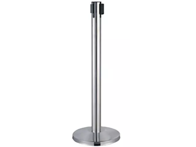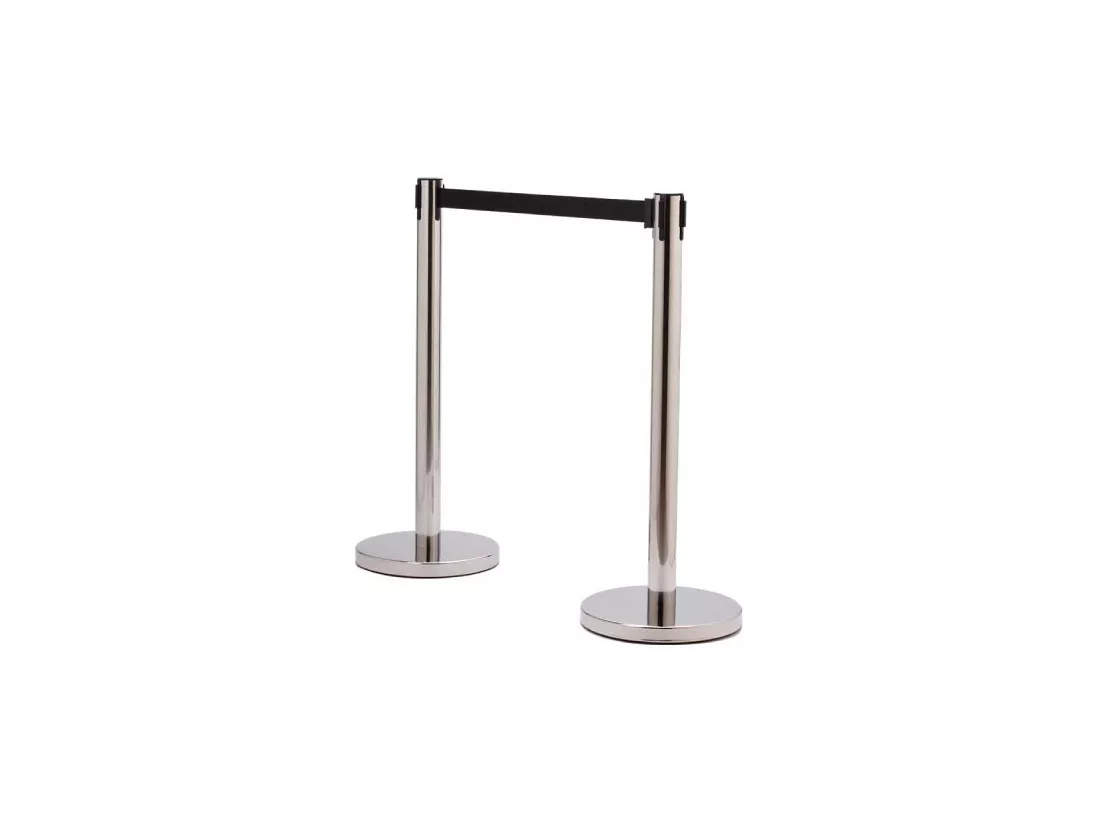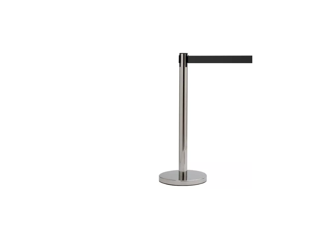Poteau de guidage en inox à enrouleur avec sangle étirable disponible en 2 coloris. La sangle est intégrée dans une cassette munie d'un système de freinage breveté, qui évite tout risque lors du rembobinage. Le système d'enrouleur vous permet d'étirer la sangle à la longueur désirée et de la rappeler progressivement au sein de la cassette.