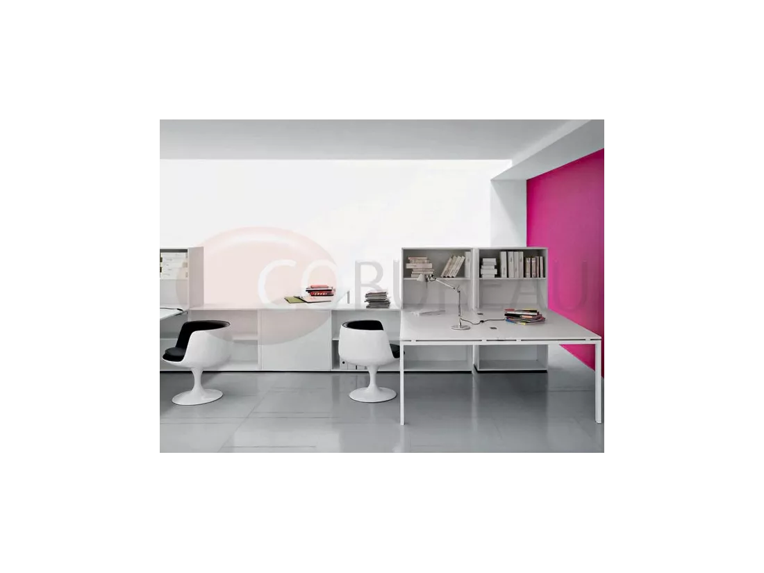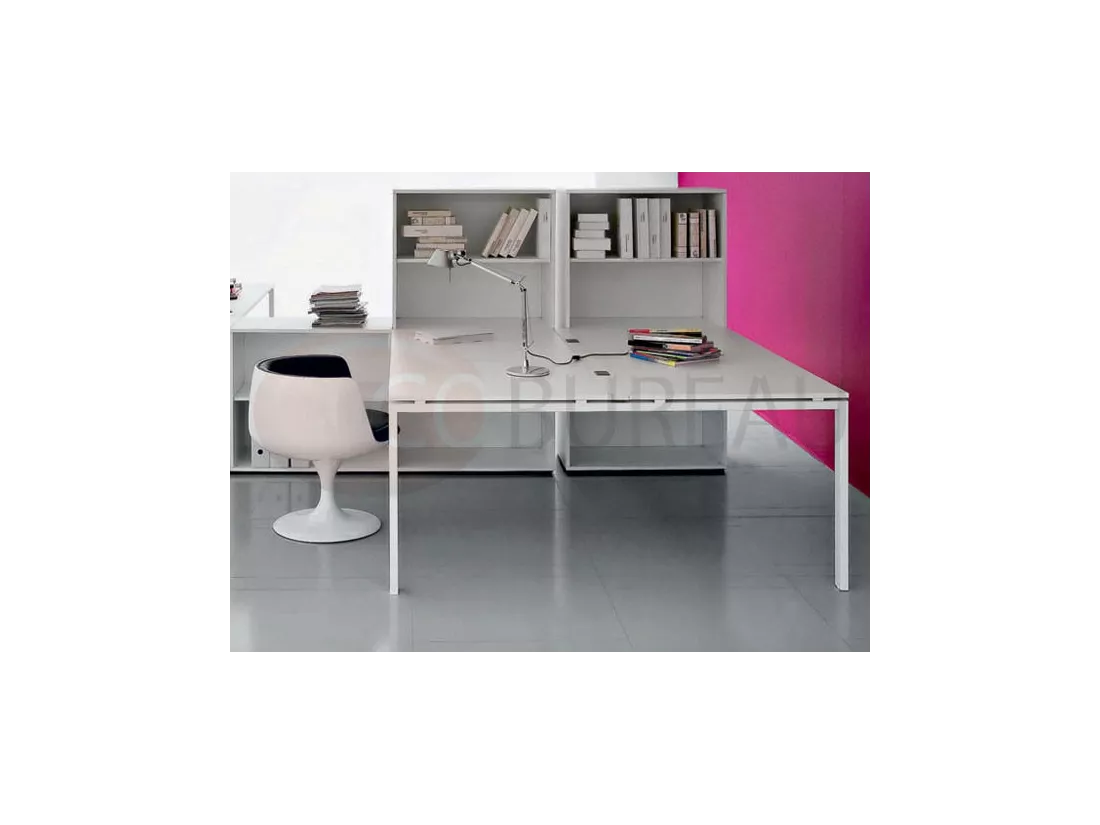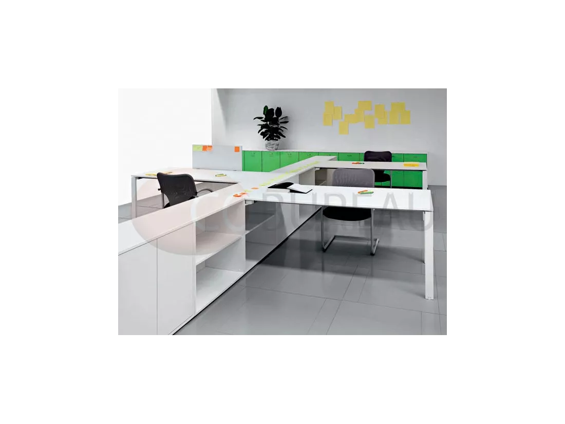 Structures, pieds en arche en tube métal section 60x30mm, pour postes individuels et doubles face à face. Électrifications horizontales avec goulottes en tôle d’acier, verticales par vertèbres de conduite câbles, trappe accès métal à encastrement sur bureaux doubles.