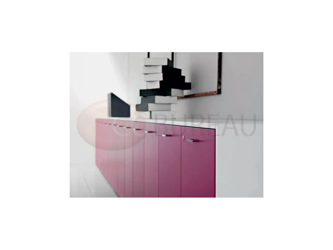 Armoires en mélaminé corps et dos ép. 18mm, tablettes ép. 25mm, top et côtés de finition en mélaminé ép. 18mm