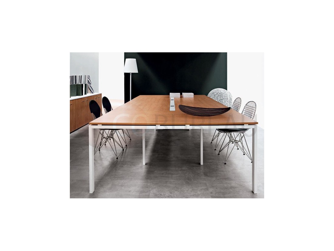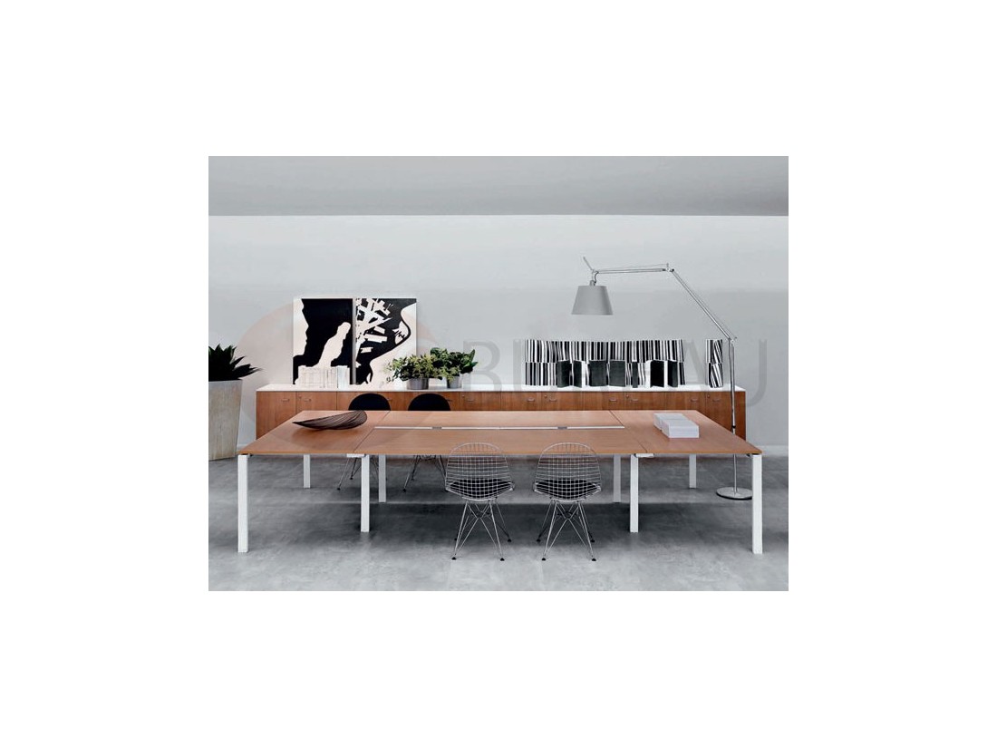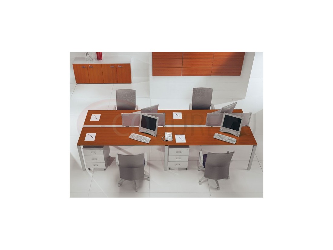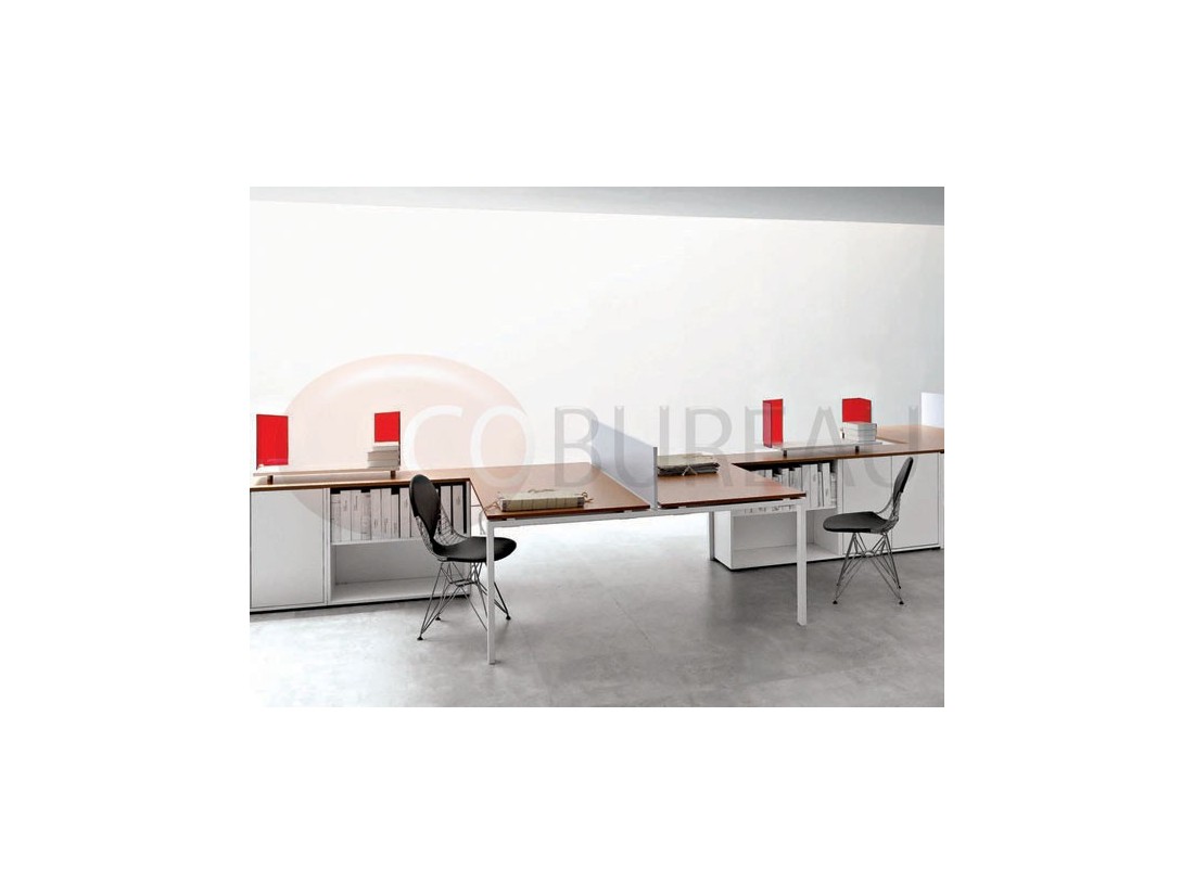Structures, pieds en arche en tube métal section 60x30mm, pour postes individuels et doubles face à face. Électrifications horizontales avec goulottes en tôle d’acier, verticales par vertèbres de conduite câbles, trappe accès métal à encastrement sur bureaux doubles.