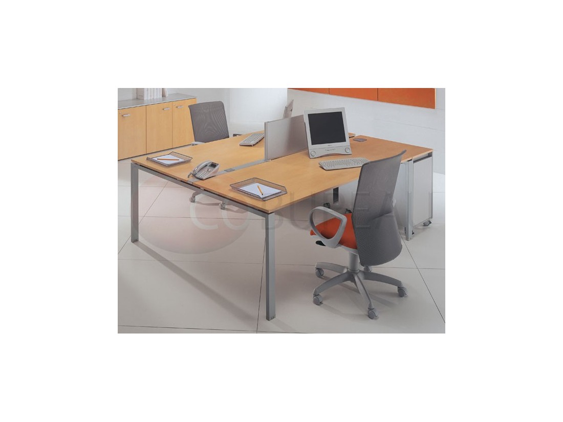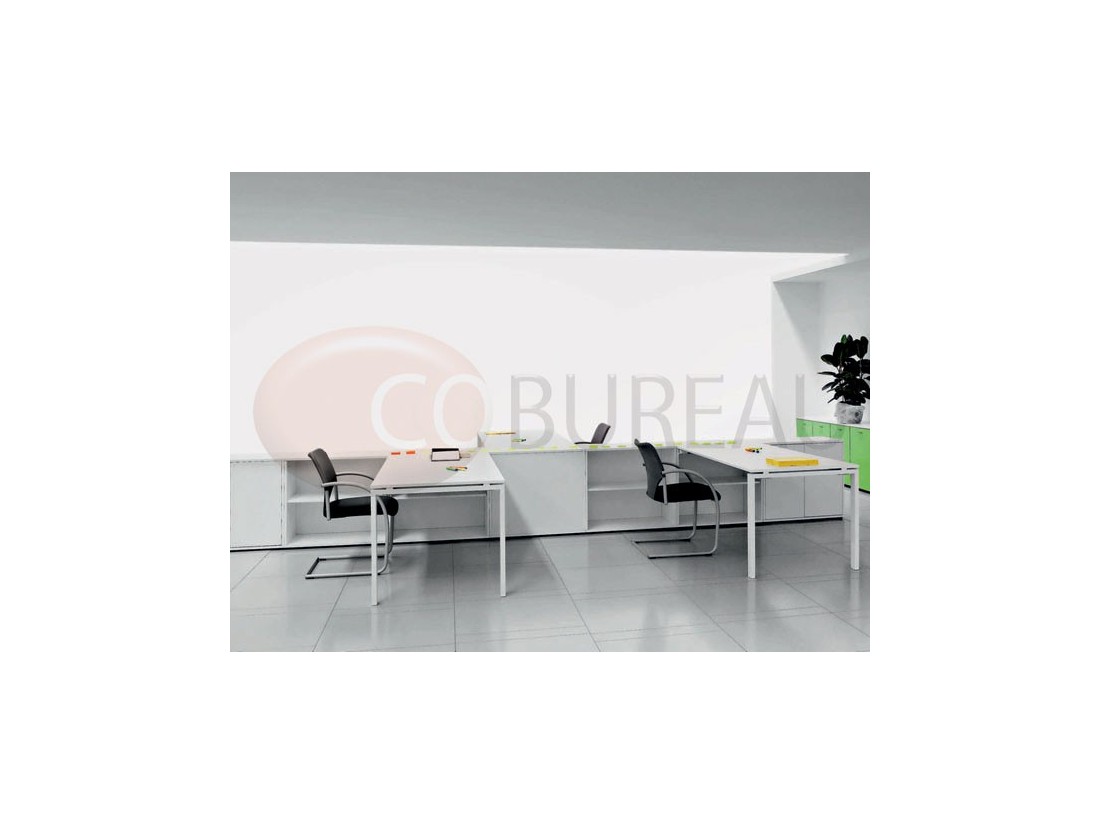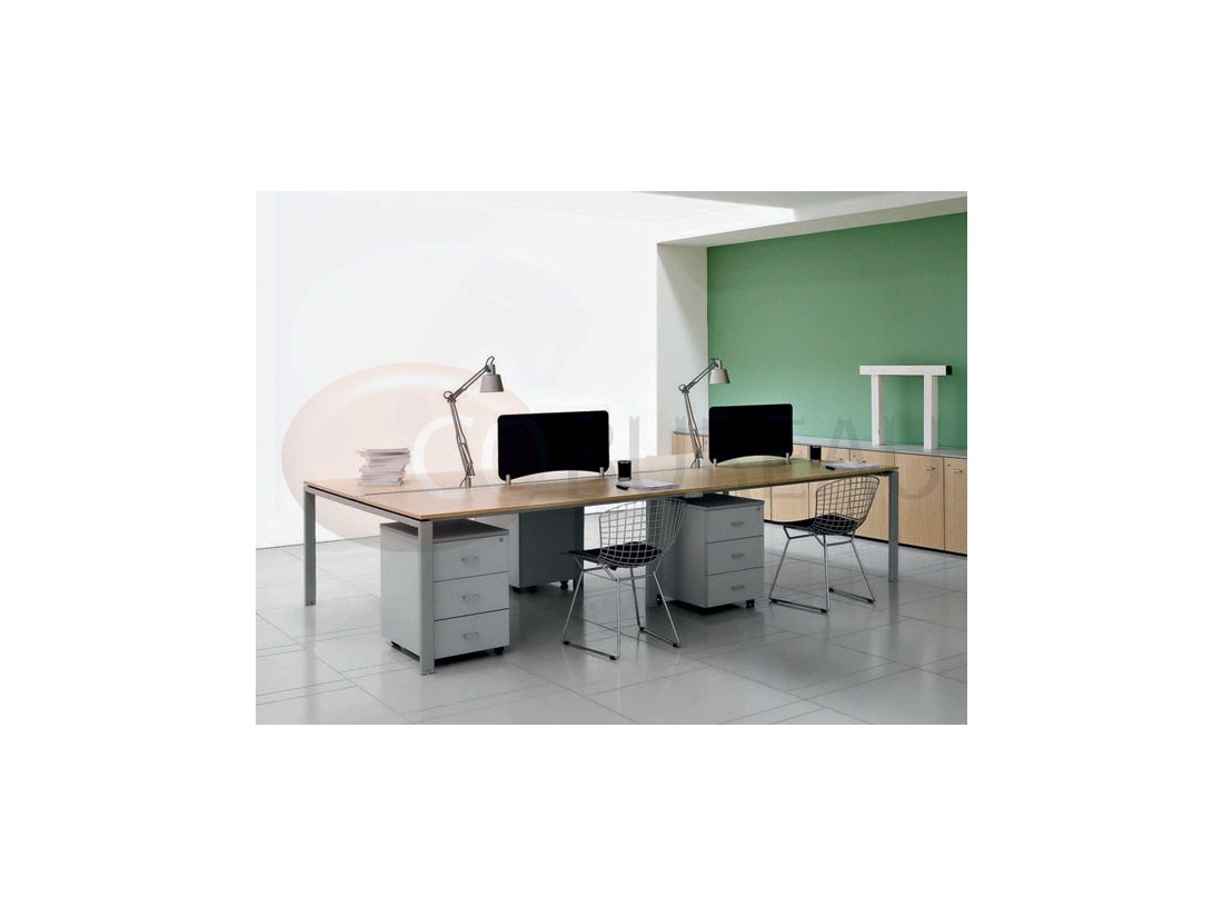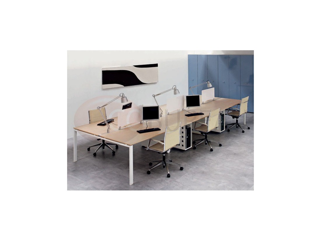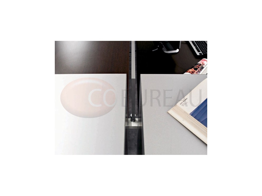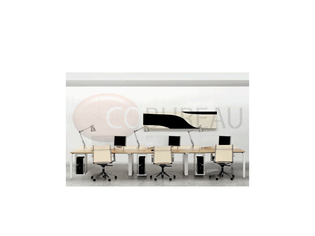 Structures, pieds en arche en tube métal section 60x30mm, pour postes individuels et doubles face à face. Électrifications horizontales avec goulottes en tôle d’acier, verticales par vertèbres de conduite câbles, trappe accès métal à encastrement sur bureaux doubles.