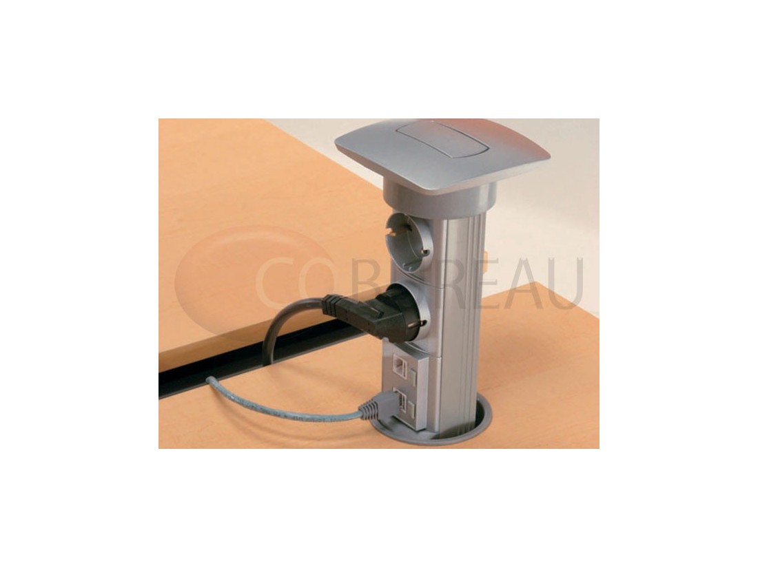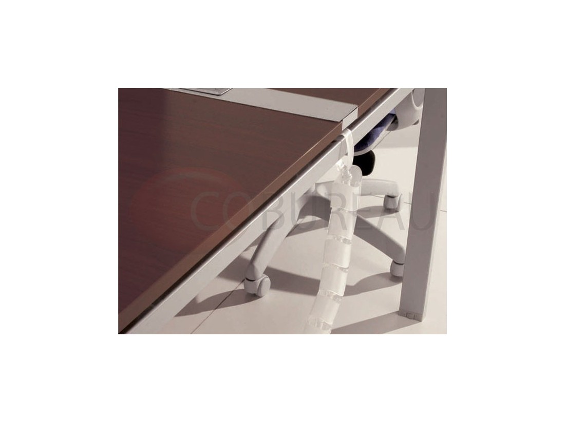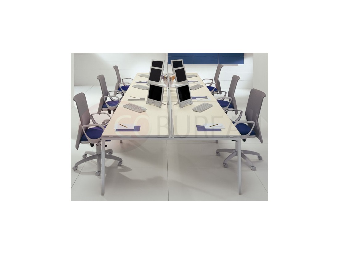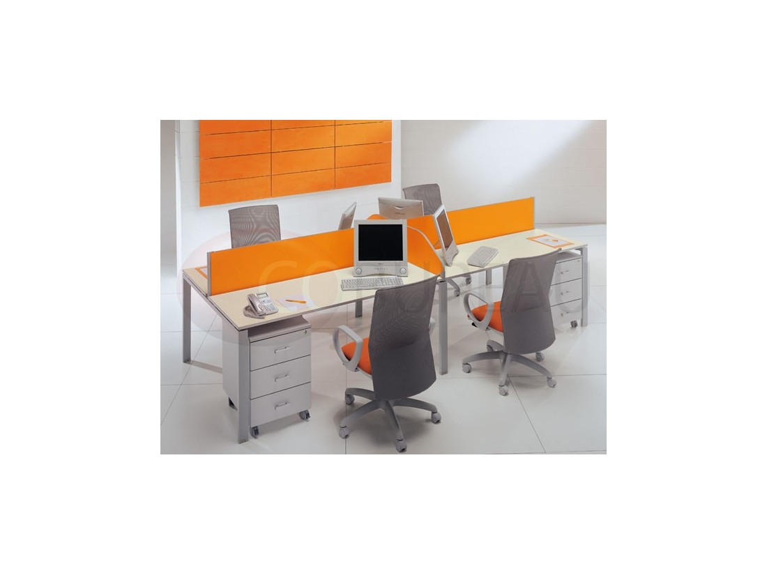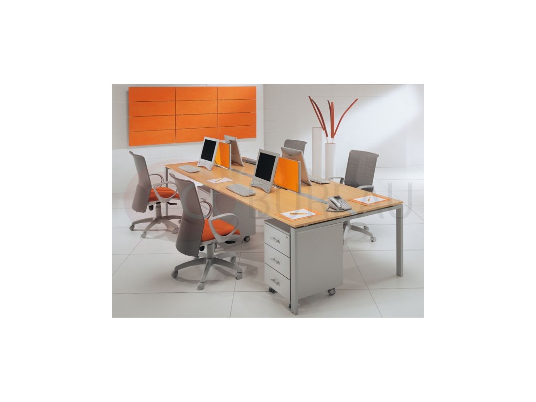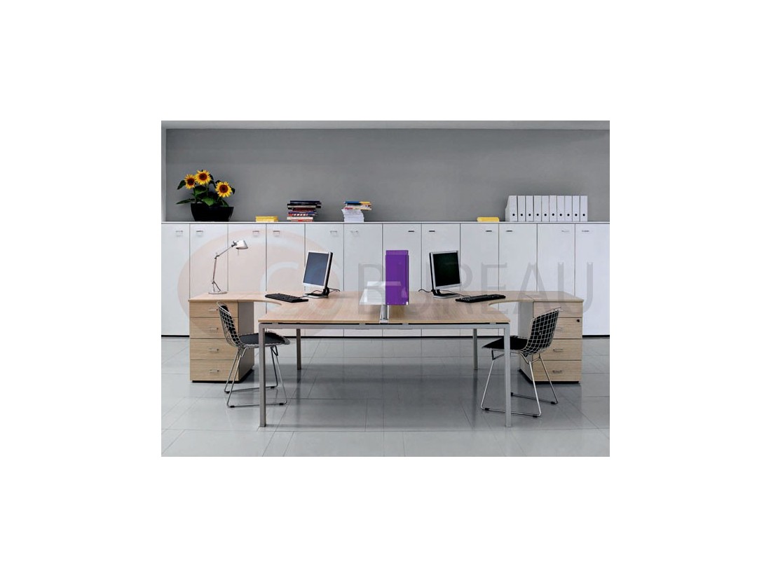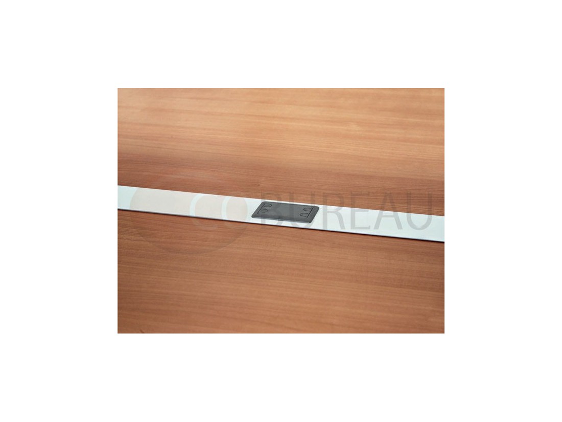 Structures, pieds en arche en tube métal section 60x30mm, pour postes individuels et doubles face à face. Électrifications horizontales avec goulottes en tôle d’acier, verticales par vertèbres de conduite câbles, trappe accès métal à encastrement sur bureaux doubles.