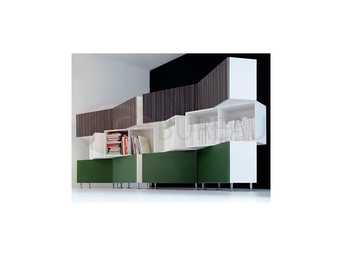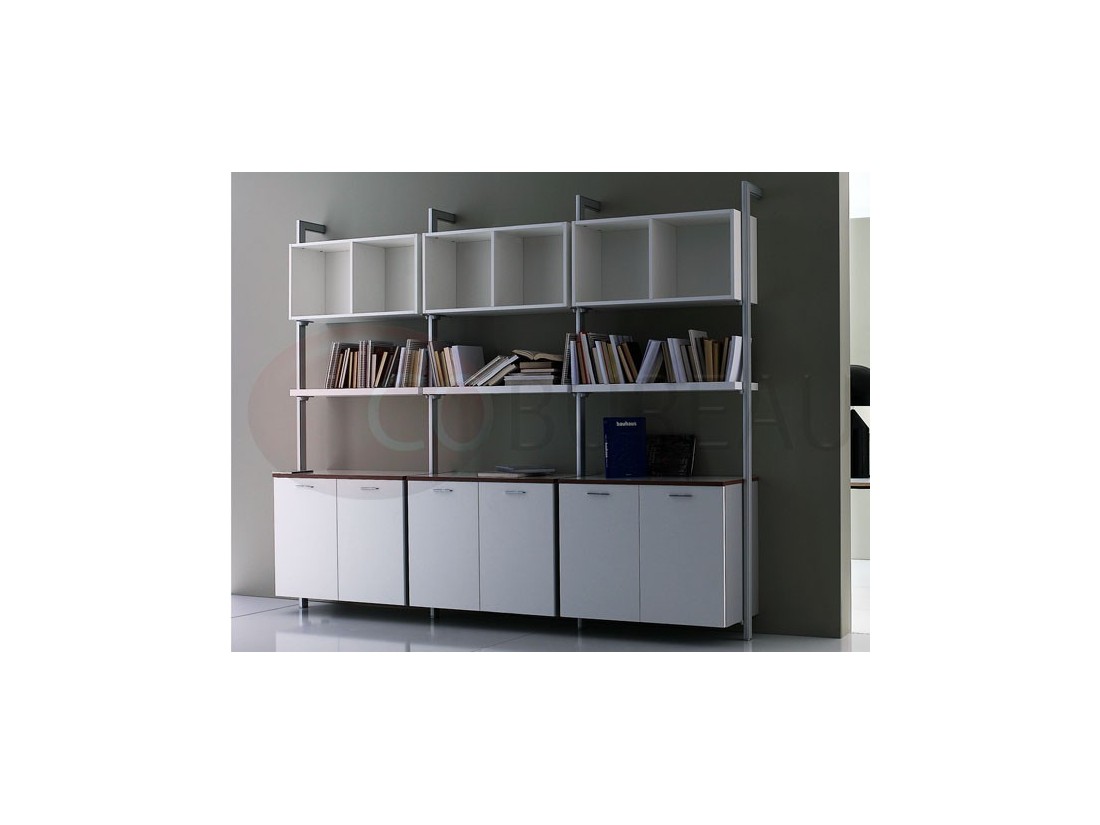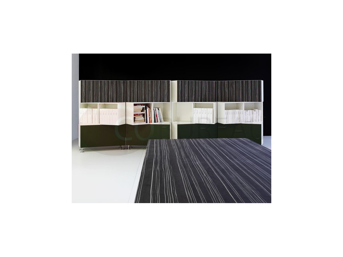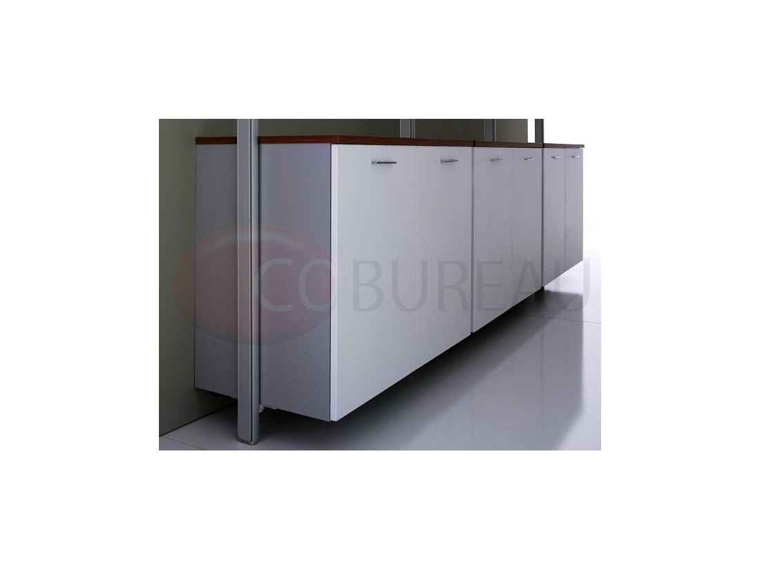 Armoires en mélaminé corps et dos ép. 18mm, tablettes ép. 25mm, top et côtés de finition en stratifié ép. 20mm